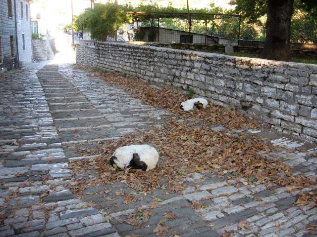 | Limestone block street, with dogs. Vitsa, Zagori, Epirus, Greece. (Photo: Allan Taylor) |