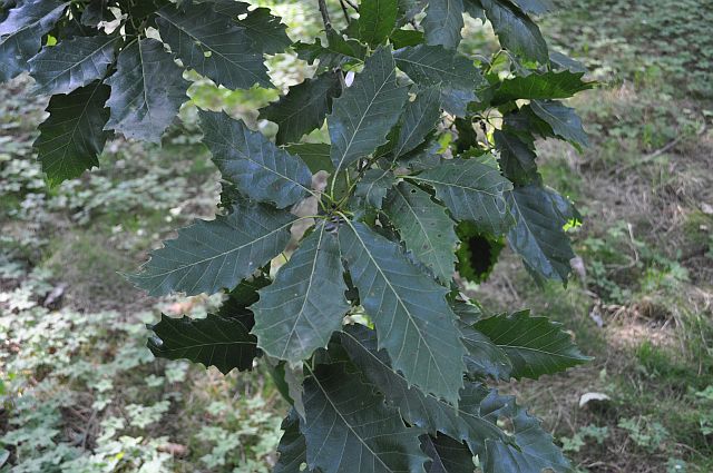 Nearby is a good specimen of Quercus ×runcinata (A. DC.) Engelm. (137 cm in circumference and 17 meters high), seemingly quite happy here. The next oak is Quercus ×calvescens Vukot., a naturally occurring hybrid between Q. petraea (Matt.) Liebl. and Q. pubescens Willd. Daniel collected this one in a natural stand in Ave et Auffe, not far from Lesve. The collection also contains Q. pubescens, collected by Daniel Dumont in the Gard region in France. Q. pubescens occurs here and there in southern Belgium always with populations of hybrids, Q. ×calvescens already mentioned and Q. ×kerneri Simonk. (Q. pubescens × Q. robur). The latter is much rarer, but found a bit farther north in the Province of Brabant but in the absence of Q. pubescens. Other oaks recorded are Q. aliena Blume (74 cm), Q. cerris L. (143 cm) and Q. macranthera Fisch. & C. A. Mey. ex Hohen. (65 cm).