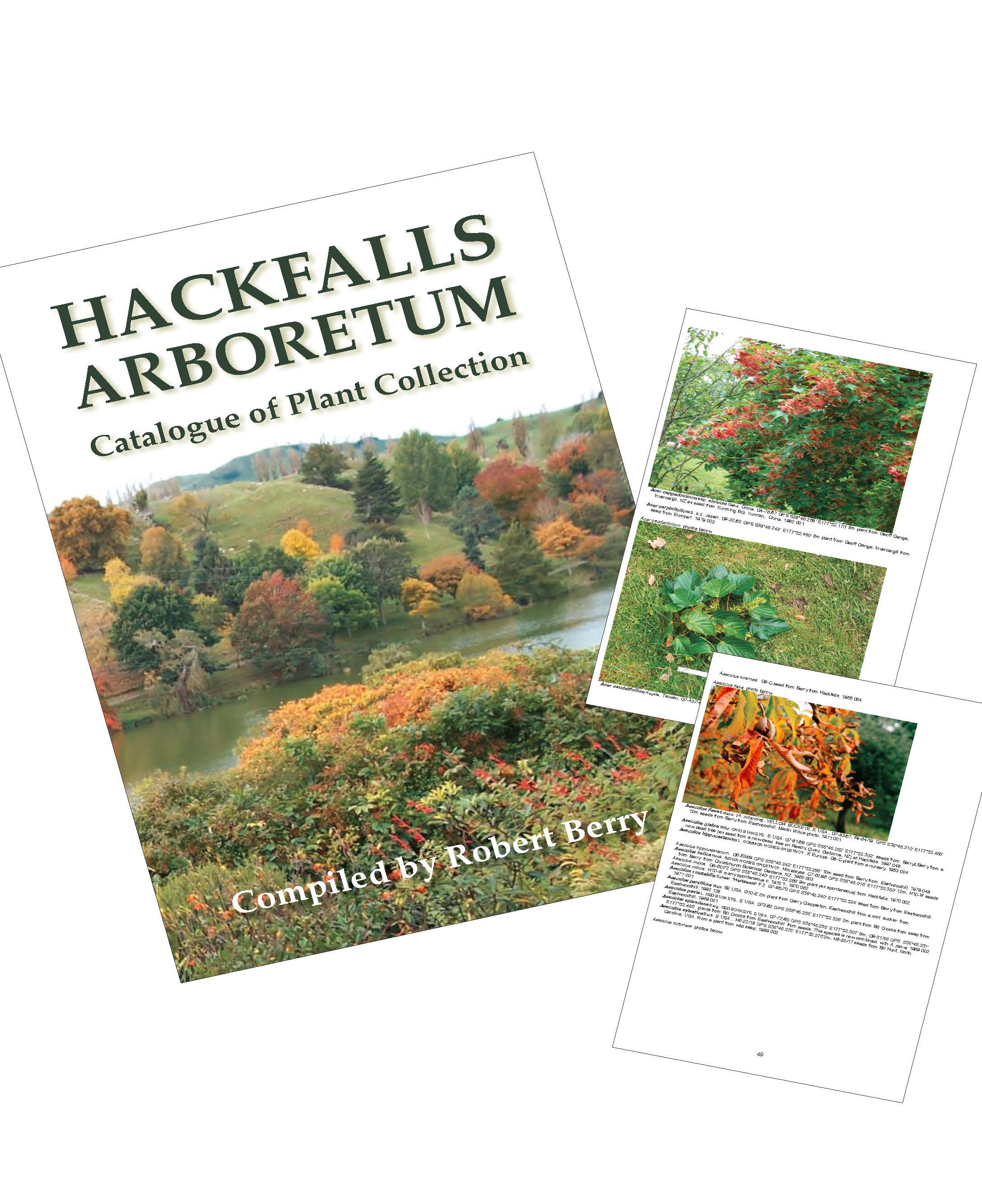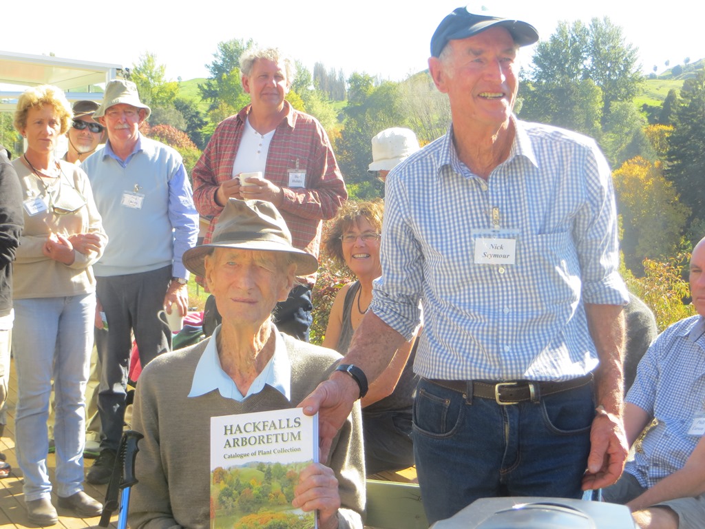 | Nick Seymour presenting to Bob Berry the first copy of Bob’s 400-page book in which he catalogues in words and photographs the nearly 3,000 trees and shrubs at Hackfalls Arboretum.The book can be ordered from Peter Jackman, 672 Back Ormond Rd, R D 1, Gisborne, New Zealand. Email: pjackman@clear.net.nz (Cost 120 New Zealand dollars + postage) | |