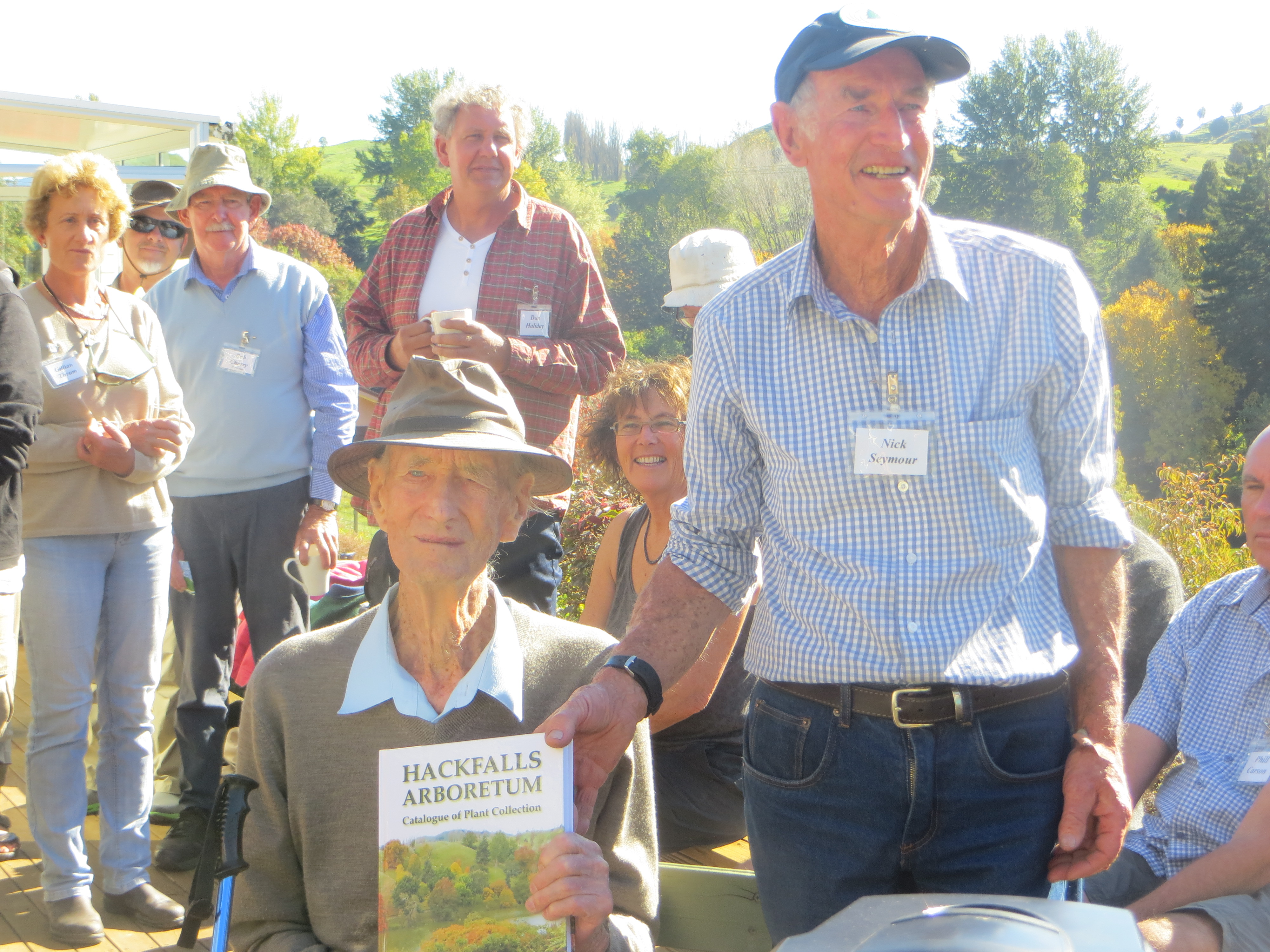 I went out to New Zealand to join the local members of the International Dendrology Society holding their AGM and combining this with the 100th birthday of Bob Berry. Bob’s birthday actually falls on 11th June, but the visit to Hackfalls was on 29th April. Hackfalls, like many properties in New Zealand, is in the back of beyond but in a beautiful setting. The house sits on a small hill enjoying the view and there by the gate were Bob and Anne waiting to greet us all (about 80 people).