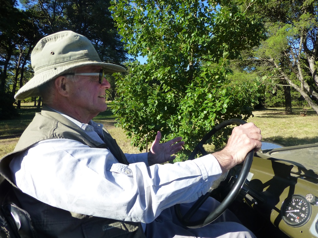 | Peter Laharrague driving round San Miguel Arboretum in his jeep. Quercus ×vilmoriniana in the background. |