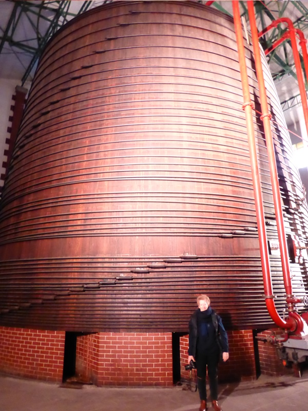 One can see the champion vat on a guided visit, which commences in a vast dimly lit space which can best be described as a temple to cooperage; a temple peopled with row upon row of megalithic 200,000 litre oak vats, any of which to my mind could have been the world’s largest. But, at the far end, one can sense rather than see that there is an inner sanctum, where finally (before one is ejected into the tasting room!) one stands before the King of Barrels. Ten metres tall, with a diameter of 12 metres, it already weighs 100 tons when empty, with