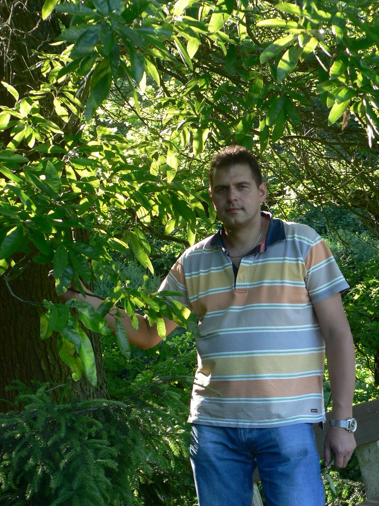 | Dušan and his first oak love: Quercus imbricaria in the Dendrology Garden, Průhonice Park, Czech Republic (Photo: Béatrice Chassé) |