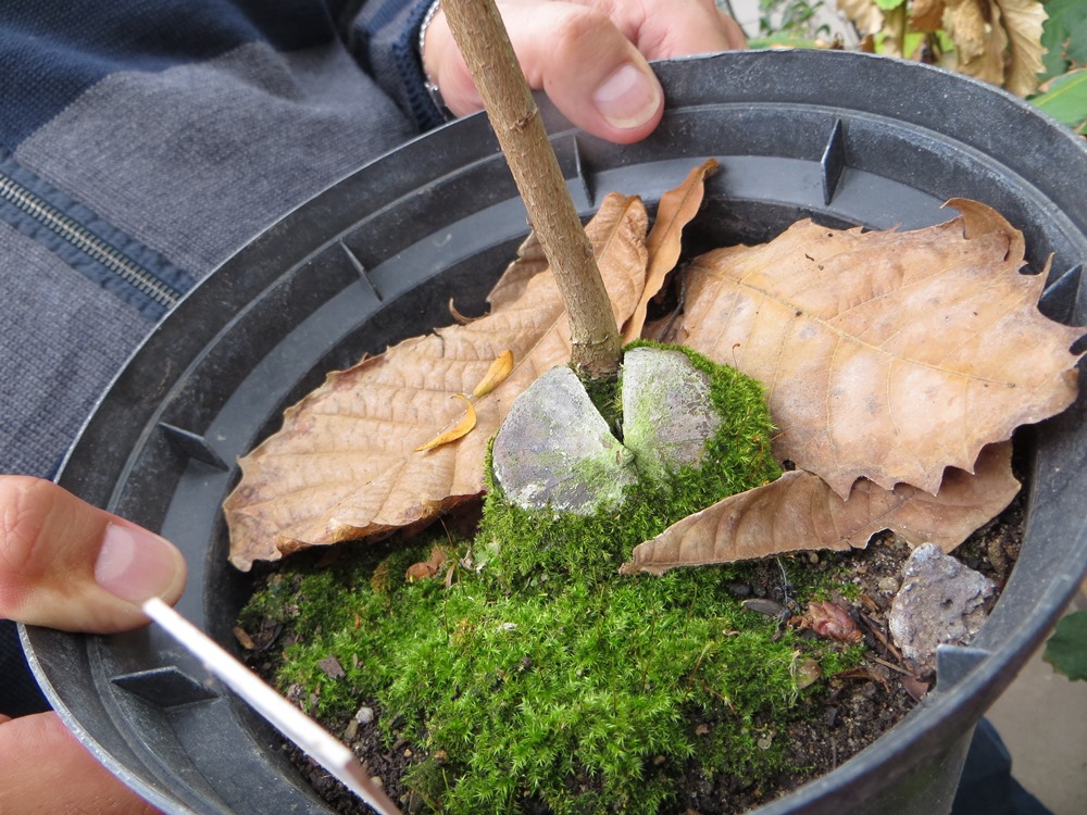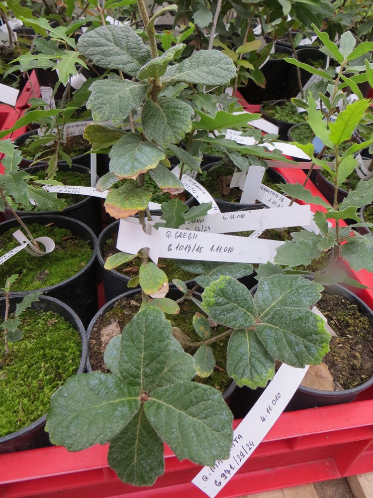 There are several hundred different oaks already growing here, all well catalogued and labeled. I will not attempt a comprehensive list here, but the full story of Plaček Quercetum is to appear in the next issue of International Oaks following Béatrice Chassé’s three-day visit there in June 2014, so reader curiosity will be satisfied! An oak that I found especially interesting was a cultivar of a hybrid between Q. falcata Michx. and Q. rysophylla Weath., Q. ‘Zehra’ (a name only provisionally accepted because it was published without a description). Dušan is particularly fond of Q. velutina Lam. and its hybrids, many of which are rather striking, for example Q. ×willdenowiana (Dippel) Beissn., Schelle & Zabel, a hybrid with Q. falcata. After a methodical walk through the Quercetum, we were taken into the greenhouse, which is thick with young oaks, some not hardy enough to venture outdoors. I was glad to see Q. insignis M. Martens & Galeotti growing in such a way that you could still see the enormous acorn from which it sprouted.