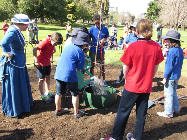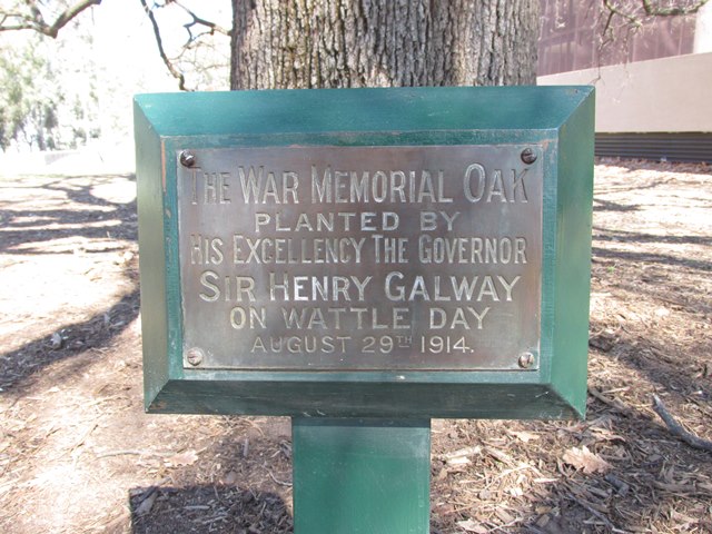 The planting was an initiative of the South Australia branch of the Australian Wattle Day League, an association founded to establish wattle blossom (Acacia sp.) as the national emblem of Australia. At a meeting on August 15, 1914, the President of the League W.J. Snowden spoke of the people of all nationalities that composed the League, and especially of those British-Australians who “by reason of their original nationality suffered now the conflict of emotions only natural when they knew that men near and dear to them were probably being slain on the battlefield every day.” He proposed to invite the Governor of South Australia, Sir Henry Galway, to “plant in a prominent position on Wattle Day a memorial English oak—the tree which, with its slowly but surely developing soundness, strength, solidity, and restful beauty, so well typified the characteristics of the British nation.”[1]